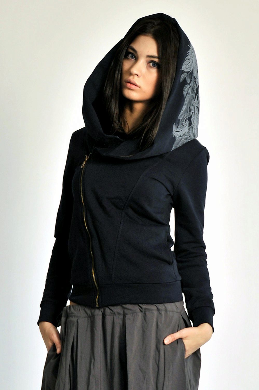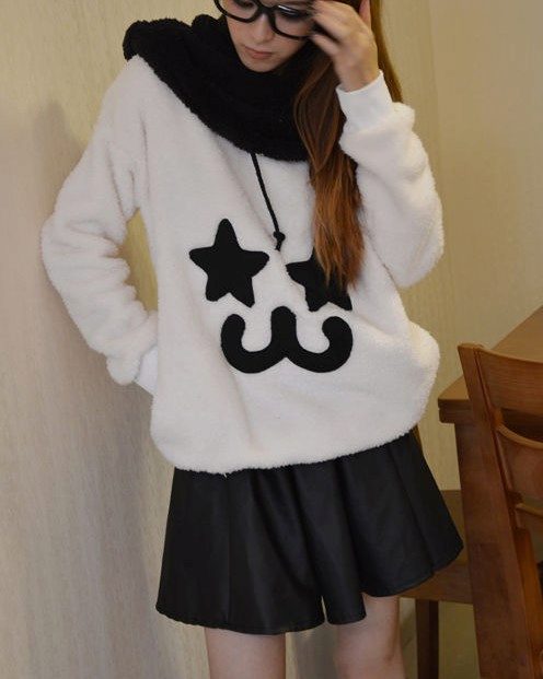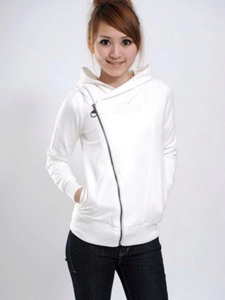 The classic combination of white and black never goes out of fashion. A white sweatshirt with a zipper diagonally and a hood can be worn with black jeans of any style.
