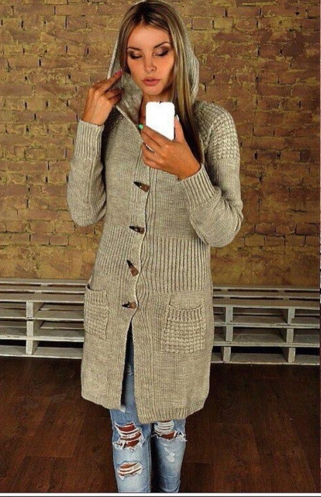The warm knit jacket is called “Hoodie”. She often replaces a light coat.
