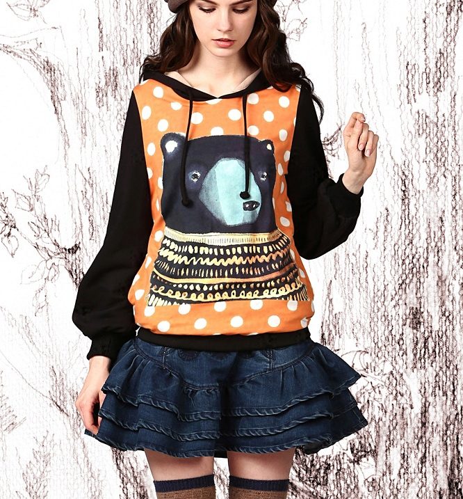 Unusual sweatshirts with ears on the hood will help to create an unforgettable and original bow. You can go to a party in a cat-like sweatshirt. The models with panda ears are in great demand. Such hoodies, as a rule, are made of fleece, so are ideal for the cold season.