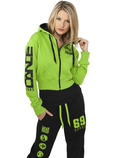 Stylish and bright looks a light green color suit. He turns on a light-colored cropped sweatshirt with a zipper and a hood, a monochromatic black T-shirt and black sweatpants. Inscriptions and drawings are used as decoration. In this outfit you can go to the gym or go shopping.