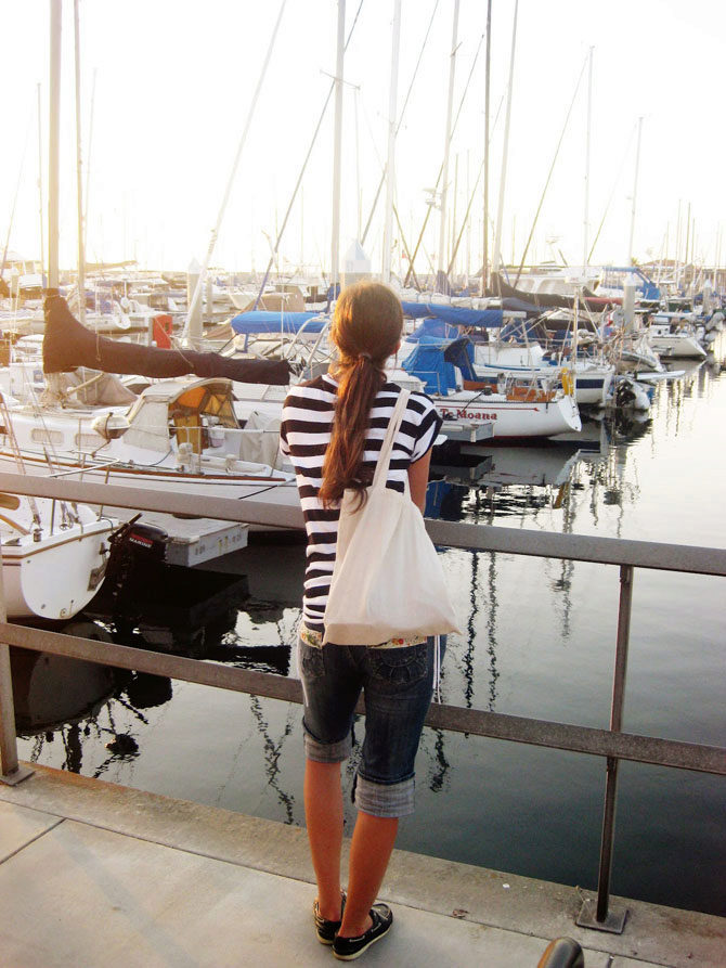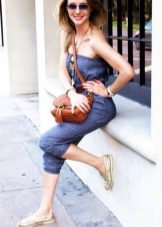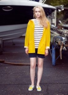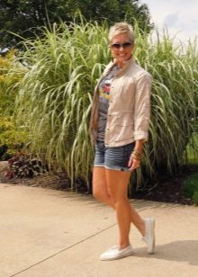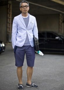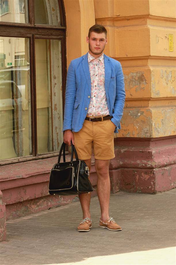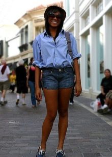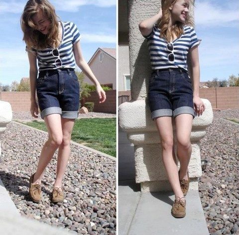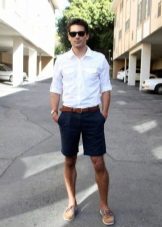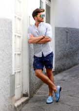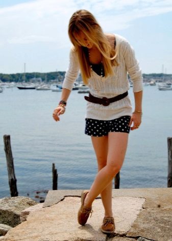 For a walk, even if it is not sea, you can safely wear top-sided with shorts. Bright blue shoes with characteristic white lacing look elegant and summer. The blue-blue gamut of the image is accentuated and complemented by brown accessories.