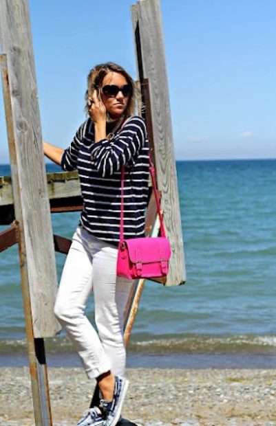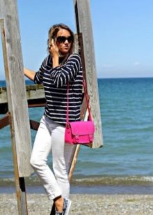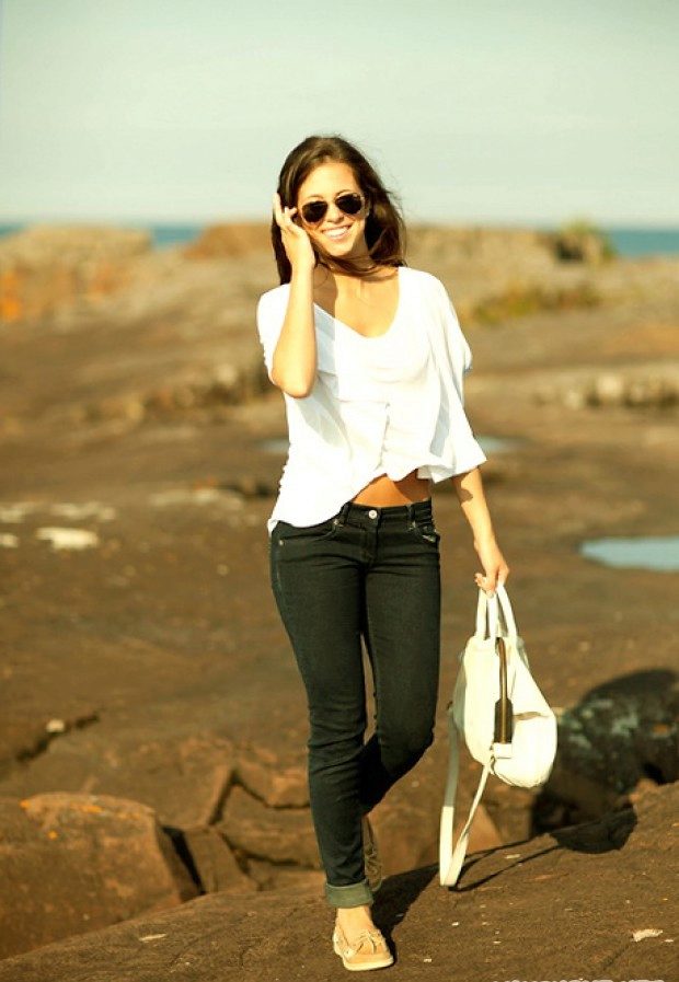 Using top siders in female images can not limit themselves to fantasies. With short sporty dresses, summer boots look great. If the summer image is replete with various and colorful details, then you can choose to it plain top-sided. Dress in white - blue marine stripes perfectly with white top-siders. It turns out the classic image of a traveler and an adventurer.