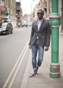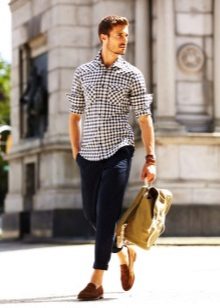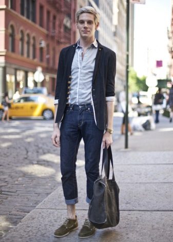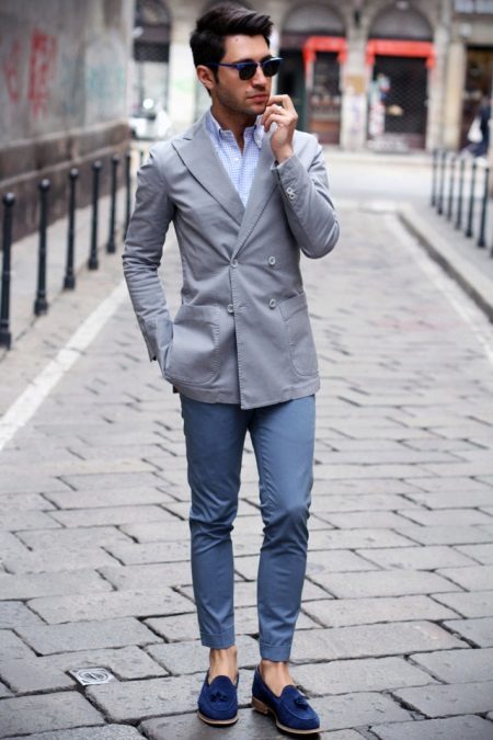Men's images with top siders are distinguished by style and ease. With dress code, it is quite possible to appear in the top siders at work. With simple cropped gray-blue trousers, double-breasted jacket and a light shirt in a small section, dark blue shoes look very noble and businesslike.