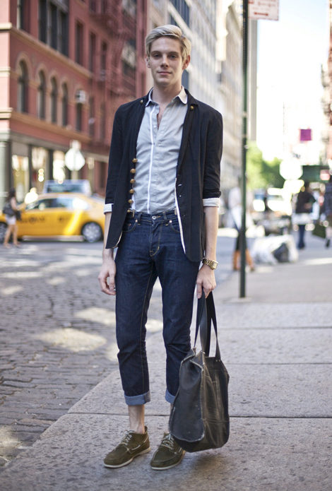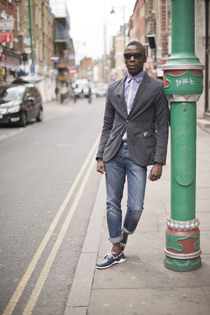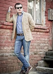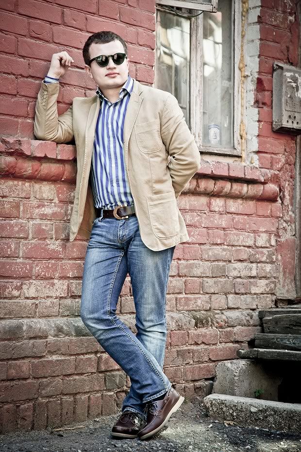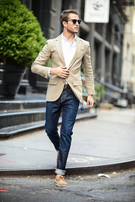 In combination with jeans, the top side looks superb. Beige top siders blend perfectly with a skinny sport jacket with a similar color. Classic blue jeans complete the flawless male look.