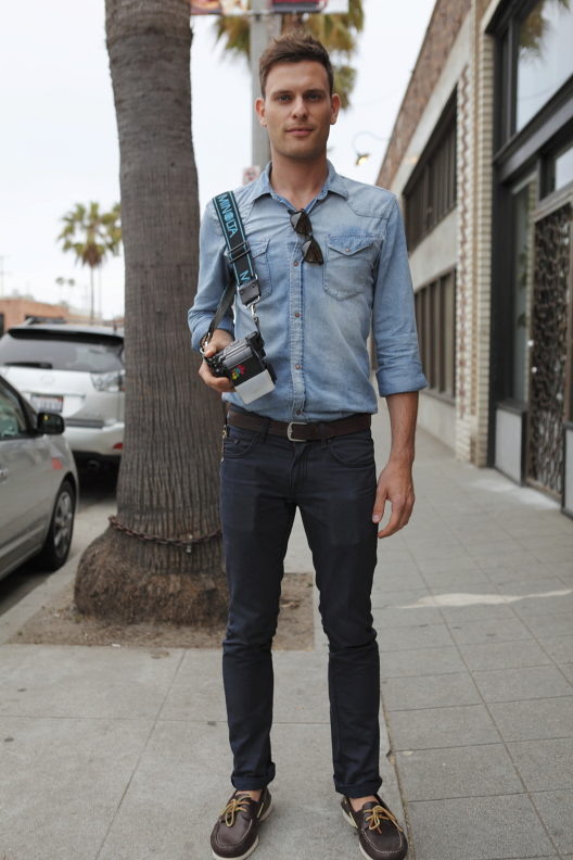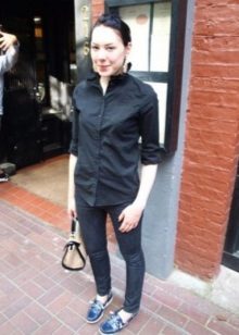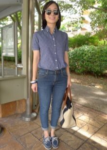 If the work is creative, then summer shoes can be brighter. Leather tricolor top-siders add originality and color to the summer look. Unusual shoes stand out against the strict gray-blue gamut of the rest of the costume, and the white leather inserts on the top side are in harmony with the white shirt. The image looks interesting and bohemian.