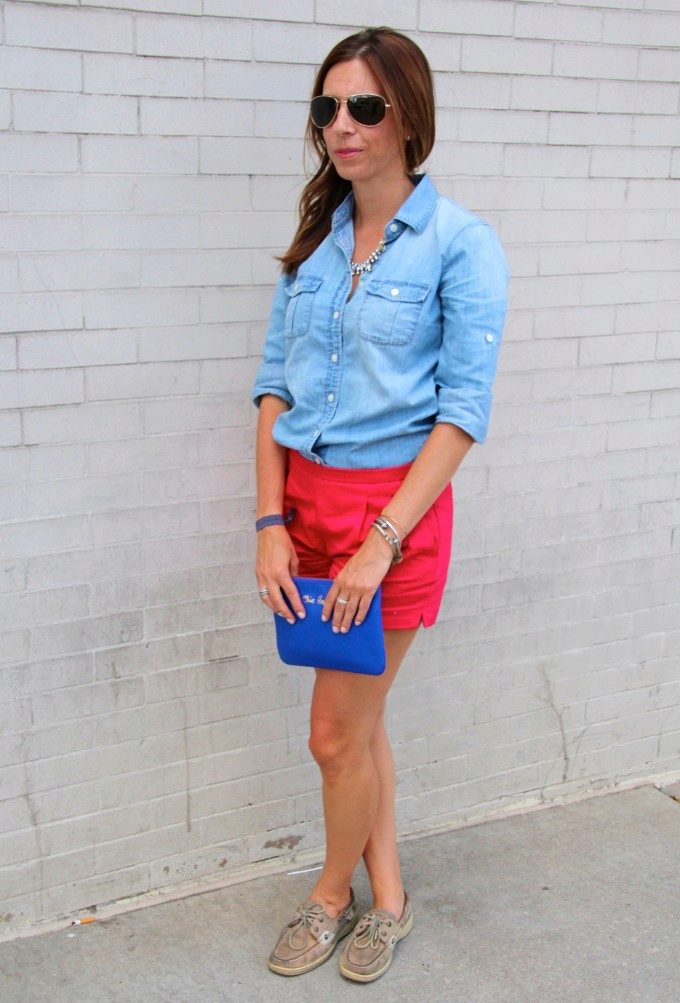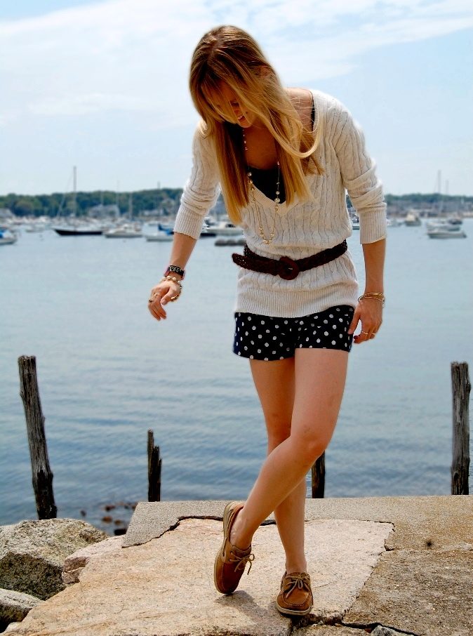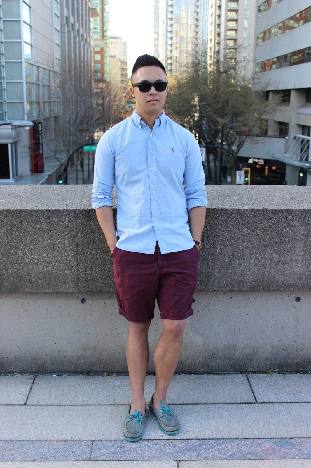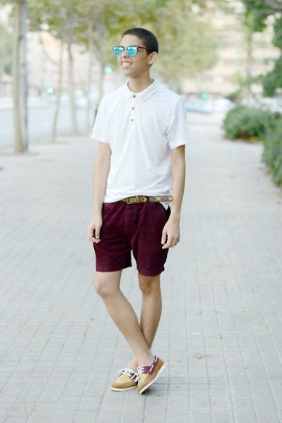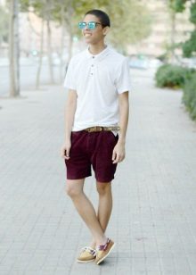 Top Siders look great with any shorts. In this image, the emphasis is on burgundy shorts, and shoes make up a pair of blue shirt.