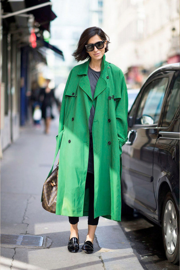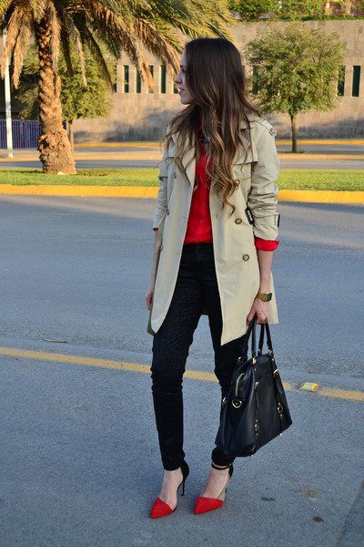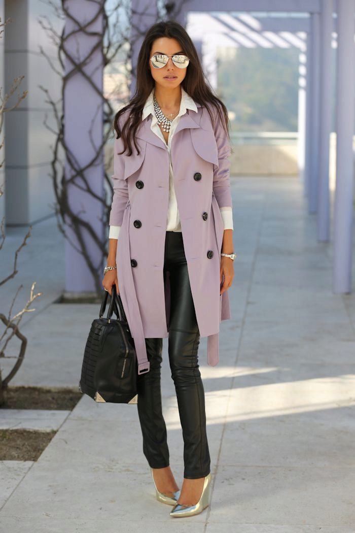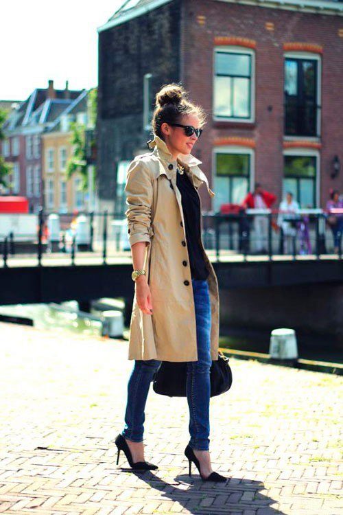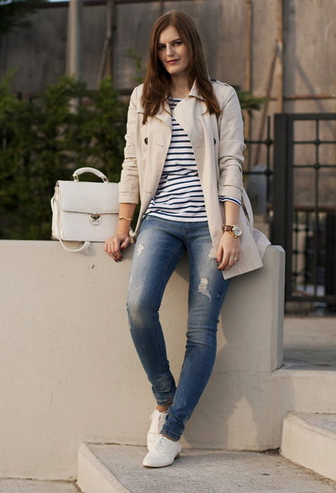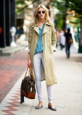 To create a street chic look, you can wear wide flying pants and a plaid shirt, a skirt with a geometric print or skinny skinny jeans will help you to add a glamor look. As for shoes, sneakers or moccasins are equally well suited to trench coats, as well as wedge or platform shoes.
