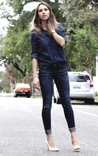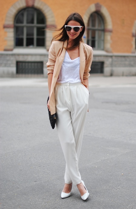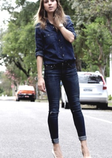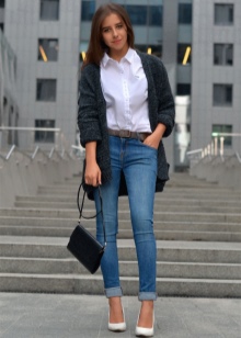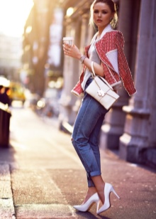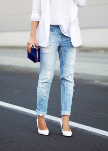 If earlier the combination of white shoes and denim products was considered unacceptable, today such a duet is considered very nice. A white shirt, a jacket of any color, jeans and snow-white shoes are the perfect kit for a casual outfit.