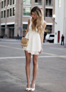 Such a common tandem is known to every woman. The dress of the combined colors, in which there is white, can be supplemented with leather white shoes. Bed shades of dresses are also perfectly combined with such shoes, forming a light romantic image.