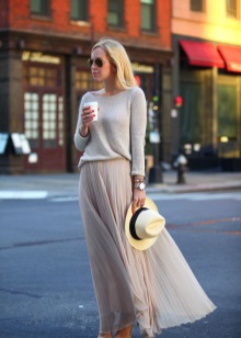 Skirts can also be successfully combined with models with a wide heel. However, maxi skirts should not be worn under such a heel, otherwise a very heavy look will turn out. The optimal length of the skirt for a combination with shoes with a steady heel is the knee line.