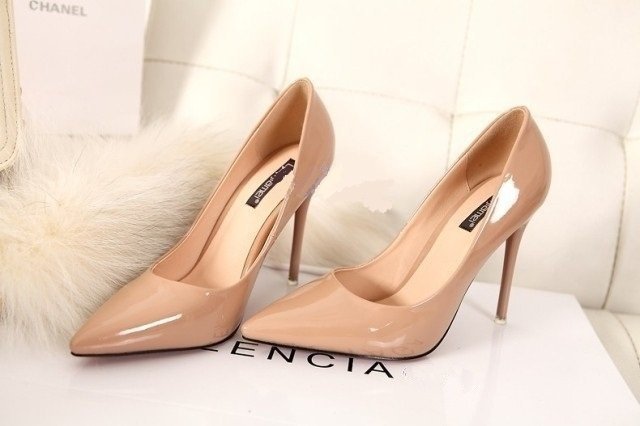 Varnish beige high-heeled shoes are able to complement almost any ensemble.