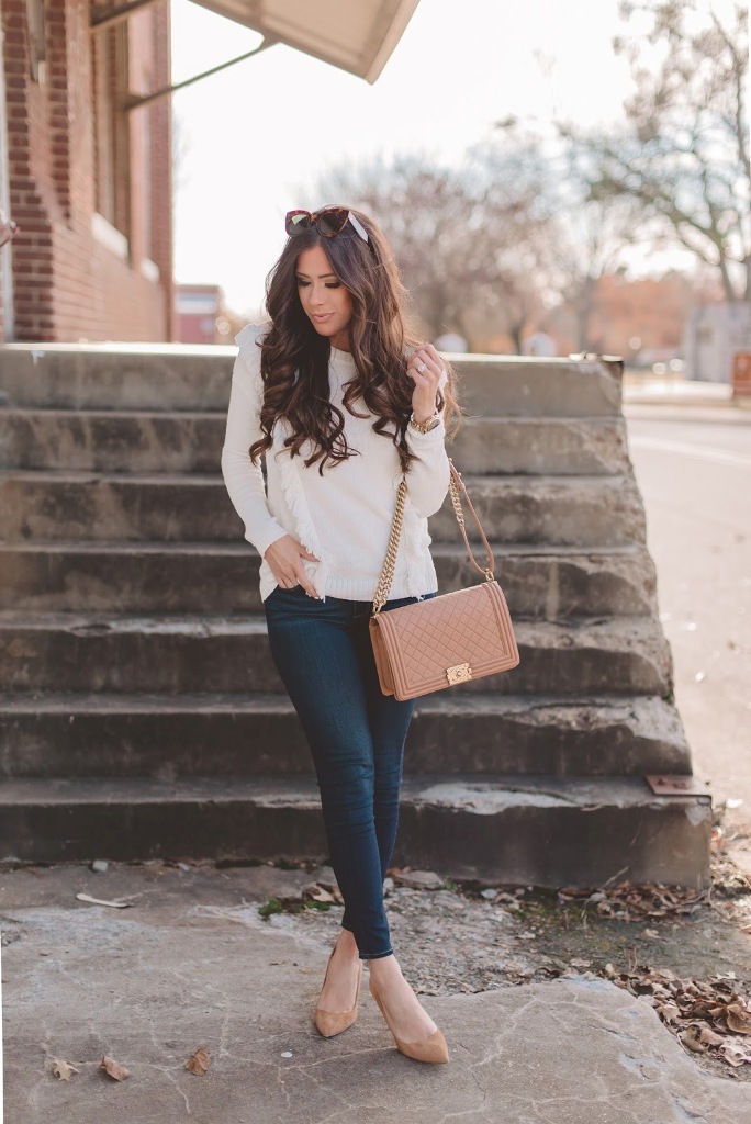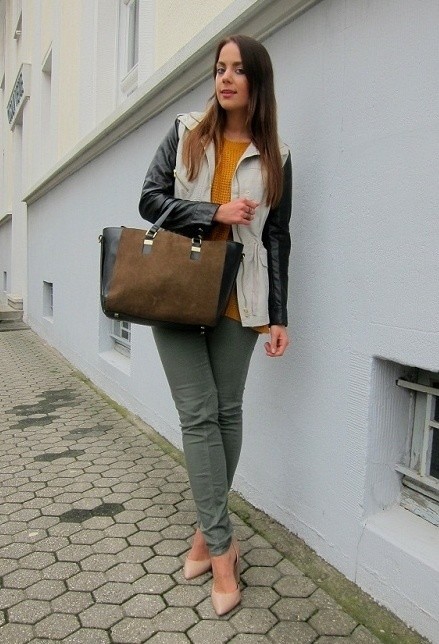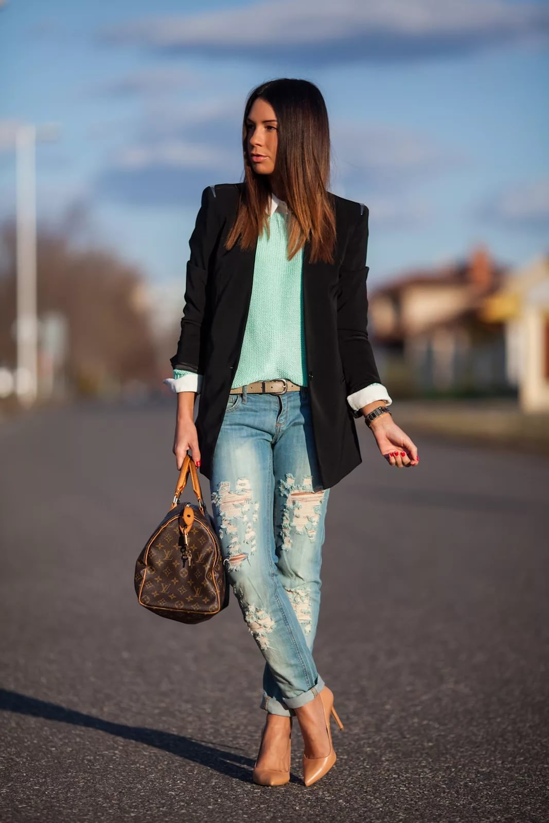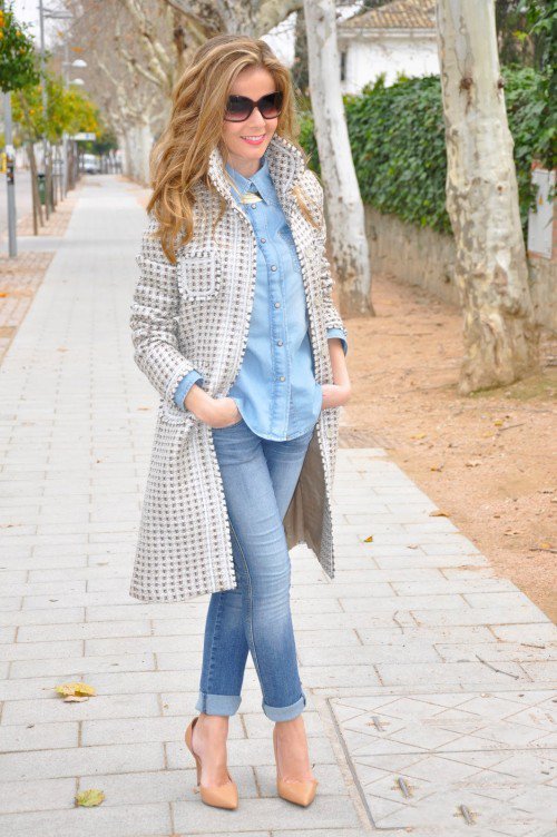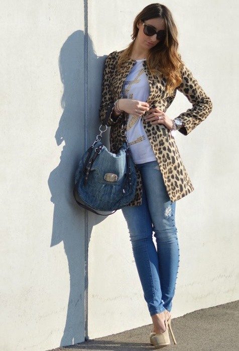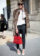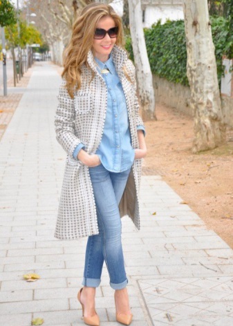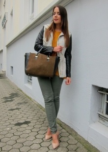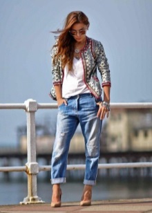 Jeans, a jacket, a loose blouse and beige pumps - in this suit you can safely go to study, walk around the city, meet friends in a cafe or cinema. A large bowling bag and a large clock emphasize the freedom-loving character and refined taste. Convenient, beautiful, relevant.