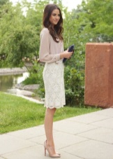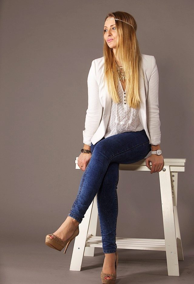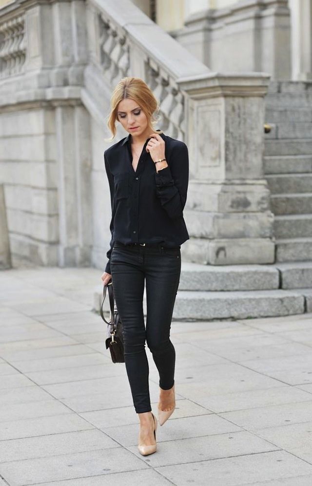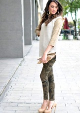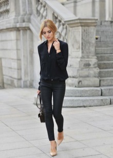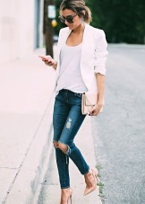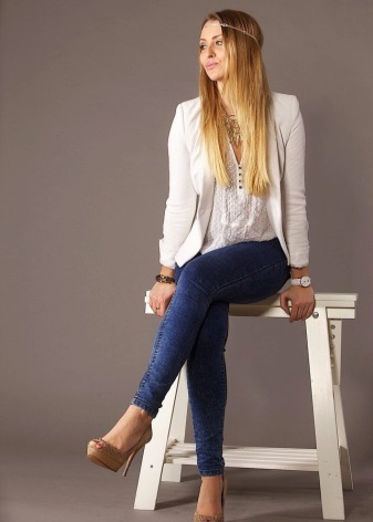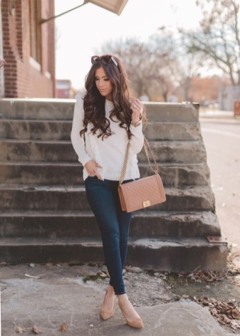 - Casual - a style that young choose. A bright representative - jeans, they are in perfect harmony with beige pumps. Skinny, straight, pipes, boyfriends - depending on the preferences and characteristics of the figure there is always the opportunity to dress in the rhythm of the city.