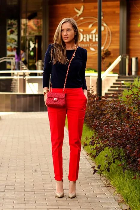 A classic combination of dark blue, red and beige. This outfit will not leave indifferent many fashionistas due to its versatility and color scheme. It is suitable for work and publication, combining urban conciseness and evening chic.