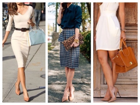 - Boats and office suit. Diminish the severity of business dress code will be elegant shoes beige. They look great with a pencil skirt, sheath dress, and straight trousers with arrows.