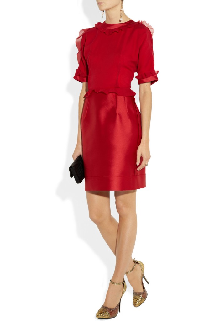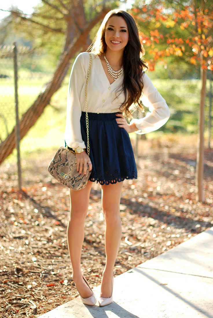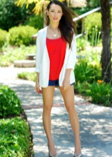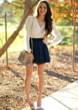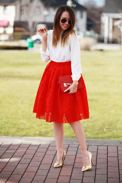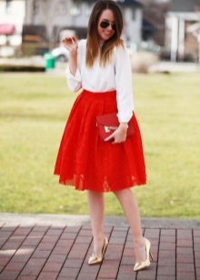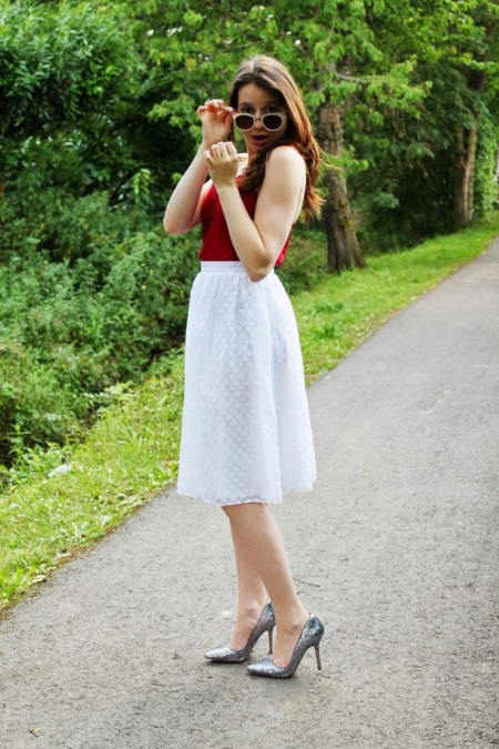 Go on a date? Then give preference to scarlet top without sleeves, white air skirt and silver glitter boats. You will look like a modern Cinderella, the image will be gentle and bright at the same time.