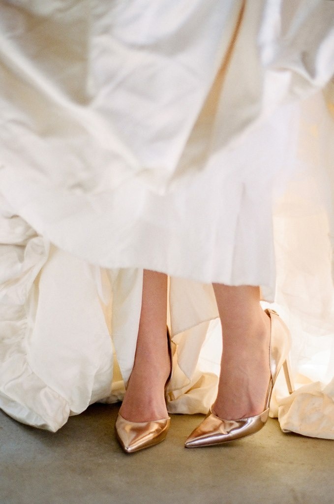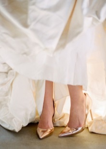 White shoes are perfectly complemented by silvery shoes, golden ones are suitable for a champagne or creme brulee dress, and the most daring brides can complement the image with metallic leather shoes.