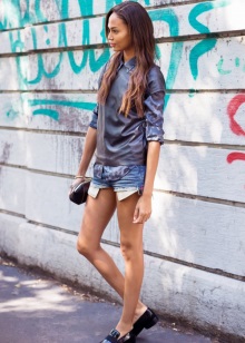 To get a stylish look in a smart casual style, combine silvery shoes with a T-shaped strap with a fluffy egg-shell-like skirt and a denim shirt. Pick up the pale blue handbag to match the shirt and complement the look with bright, massive jewelery.