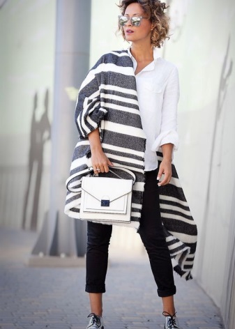 Laconic mom-jeans and a strict vertical striped turtleneck are suitable for everyday wear. The image does not look boring, thanks to the metallic fuchsia loafers. It is complemented by a small handbag with a fur keyring and sunglasses.