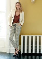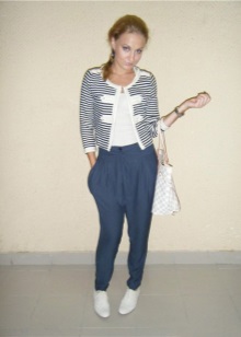 - Banana pants are something unusual and even informal, but they will harmoniously look with classic stiletto heels, covered with high wedge shoes or with “labutenes” on a high thin heel.