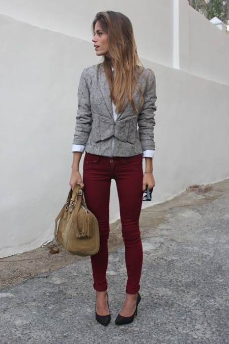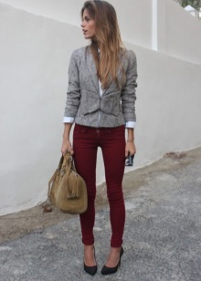 Maroon trousers will look great with black shoes, as well as trousers of rich red color. Both blue and white shades of trousers, as well as models of brown, gray and purple colors will do. Particular attention should be paid to gray trousers, carefully choosing shades: it is better to opt for darker colors.