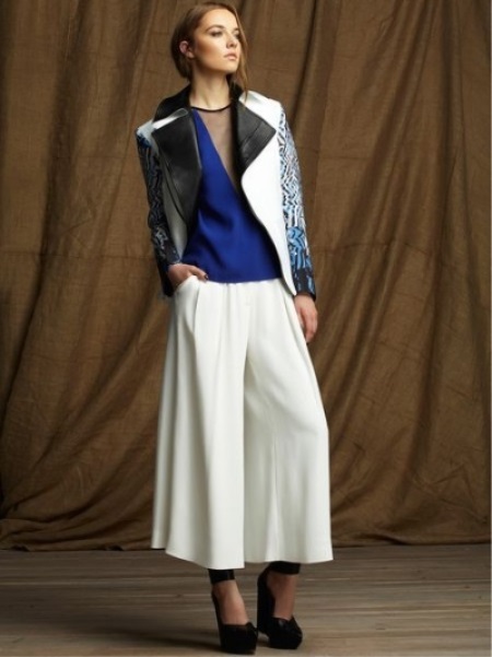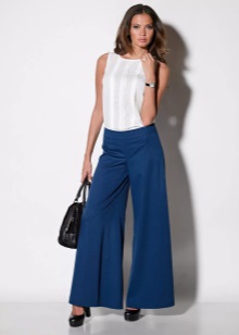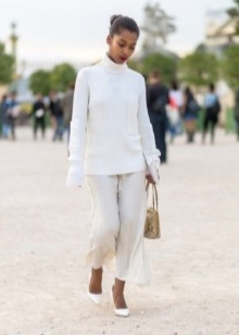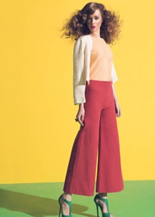 - Skirt-pants needs shoes exclusively on high heels. Since the trouser legs of this model of trousers are very wide and loose, there is a need for a visual increase in height, which can be obtained thanks to the heel.