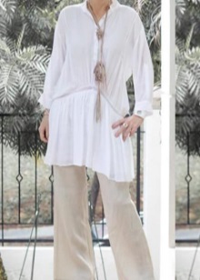 - A clean light look, consisting of wide trousers of a light milky shade and a white-and-white loose shirt made of light fabric, is complemented by light blue high-heeled boats. As accessories selected gold jewelry on the hand and a white bag on a long strap.