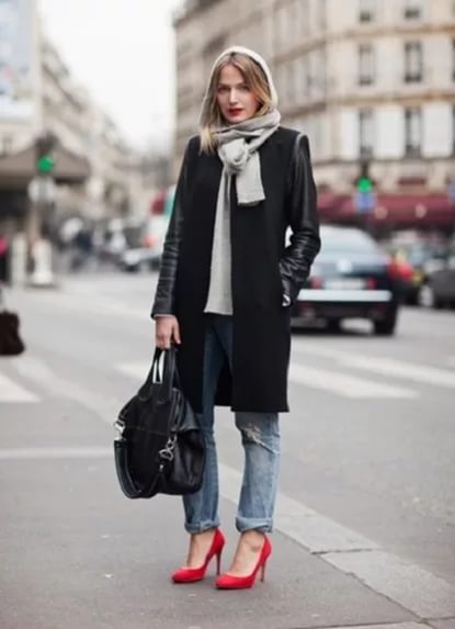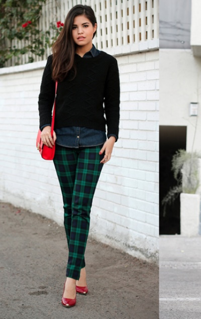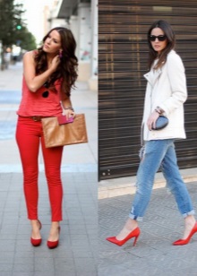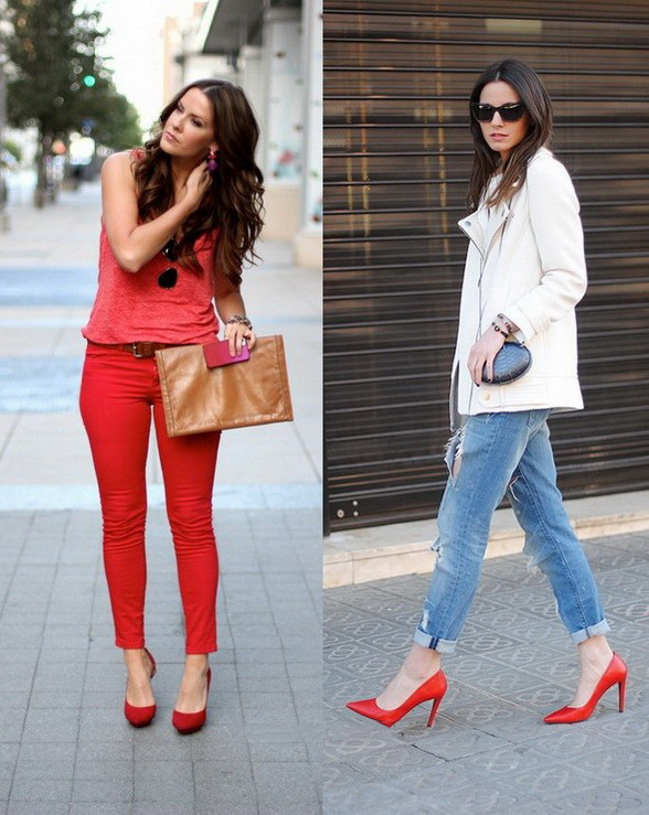 White and black pants are perfect for red shoes, even when it comes to office style. Trousers of beige and gray colors will fit well into the image, regardless of the saturation of the chosen shade. Unusual, but just amazing and very harmonious with red shoes look dark green trousers.