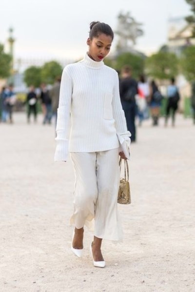 White shoes are perfectly combined with rich shades of trousers, complementing and shading the image. Green and blue pants, yellow, sky blue and soft pink pants will be perfectly complemented by white shoes. In addition, shoes shade baked milk is perfect for white, black and red pants.