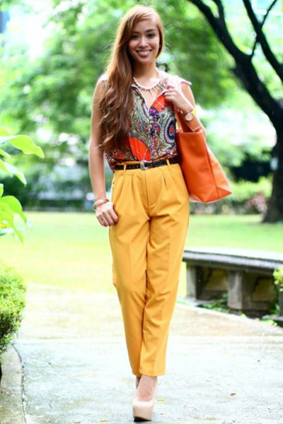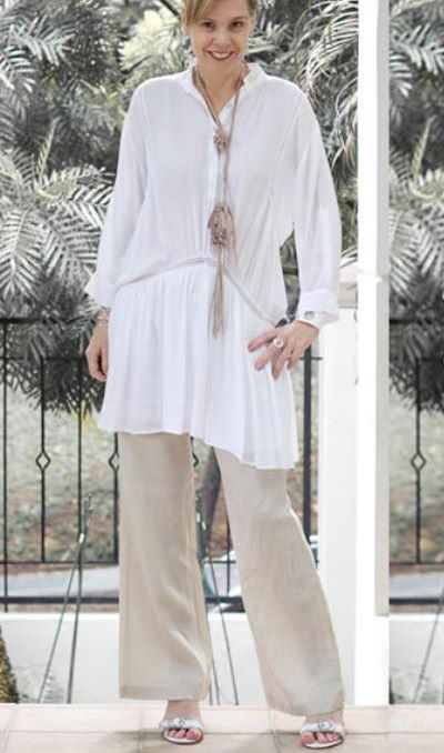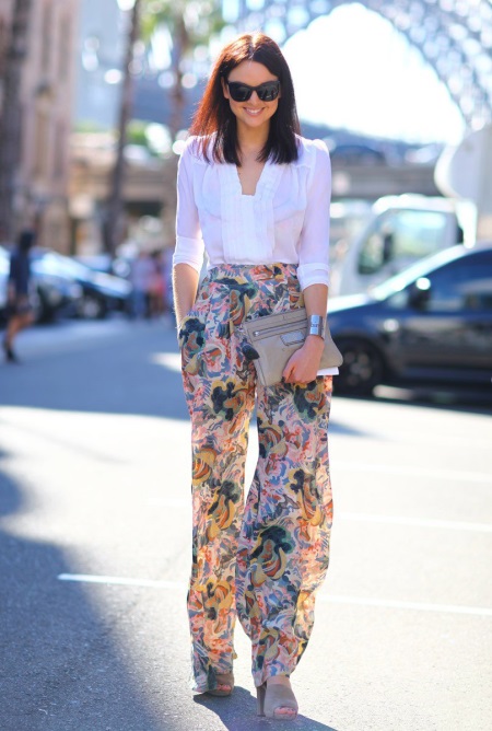 - The stylish combination of light chiffon trousers of variegated colors and a white cotton blouse, with a 3/4 sleeve and decor in the form of small ruches, is complemented by sand-colored suede sabo shoes, high heels and open toe. A stylish clutch to match shoes was selected as an accessory.