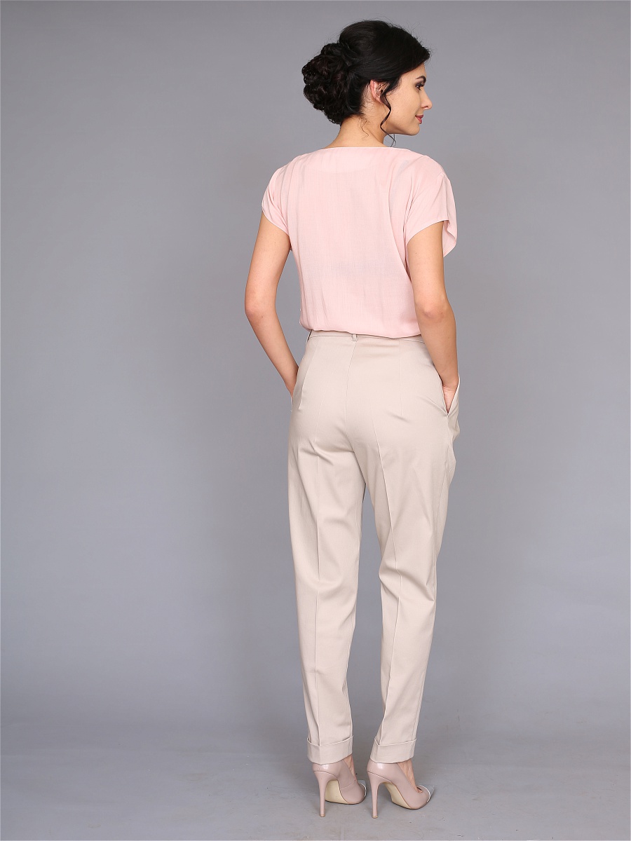 - The combination of a silk blouse of a cornflower-blue color, decorated with ruffles at the collar and ties at the neck, and straight-fit trousers with a high waist, looks gorgeous. The pants have a slightly shortened length and small cuffs that reveal the ankles, so they are perfectly combined with elegant suede shoes in black.