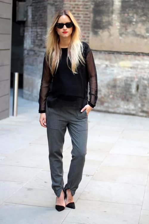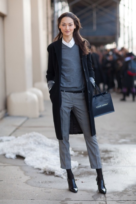 - 7/8 length pants in a classic style, a white shirt, a gray-blue pullover, worn over it, and a black cashmere coat are a perfect example of a business attire. The image is complemented by high patent leather shoes and black nylon pantyhose.