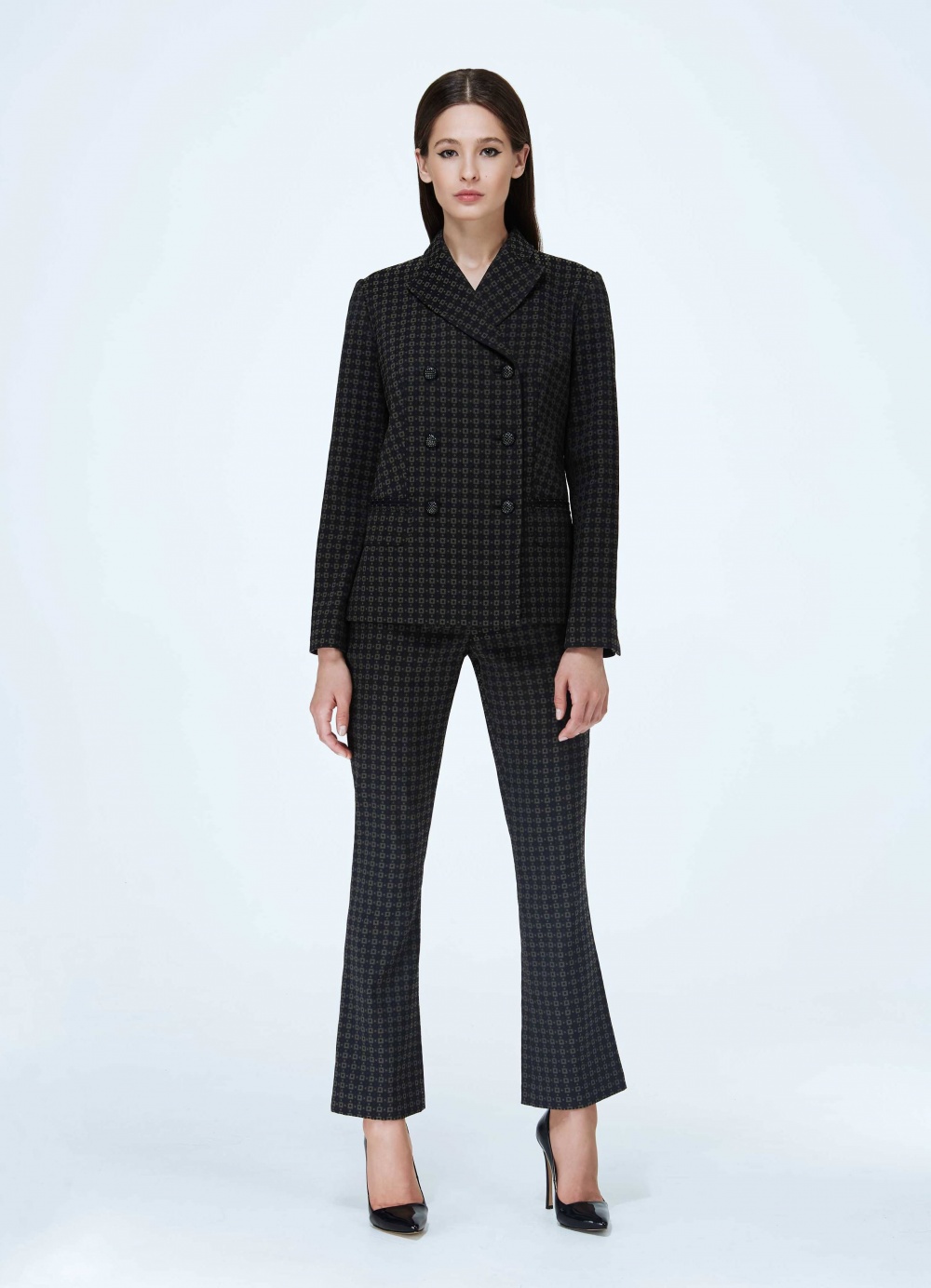 - The suit, consisting of free-fit trousers with cuffs and a free jacket, is perfectly combined with a light white blouse with a floral print. The outfit is complemented by lacquered shoes to match the suit, which combine an open toe, a thick platform and a high heel.