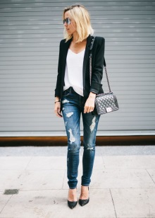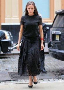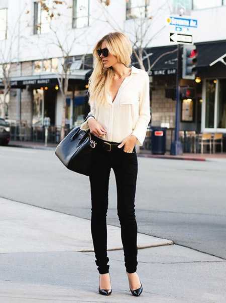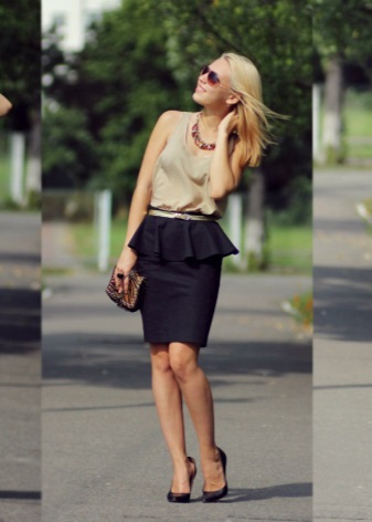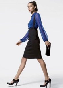 In a set with a classic business suit, lacquered black pumps or shoes with a strap look good, like blotches of a piece of freedom in an atmosphere of rigor and correctness. And the addition will be a black flat lacquered handbag or clutch.