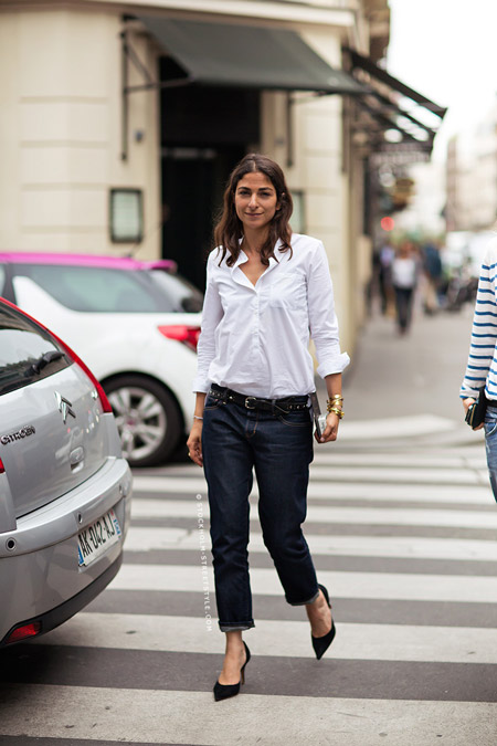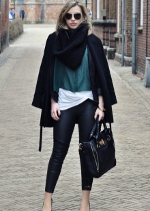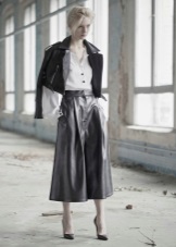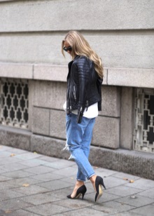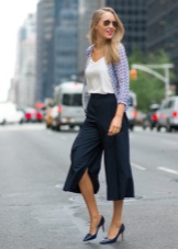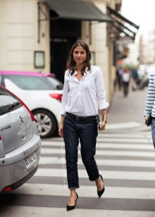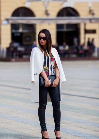 Pants can be of any length. Effectively in combination with black boats look tight pants made of leather. Pure white blouses or shirts are usually picked up. White color is sometimes diluted with floral prints. besides the classic top, various T-shirts with inscriptions, alcoholic T-shirts in a tandem with a jacket, gray coats, trench coats, long sleeves will do.