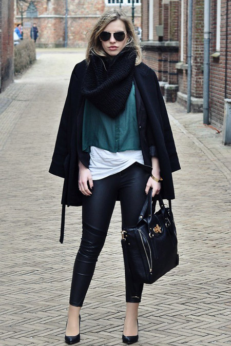 Unbanal and harmoniously black shoes will look with sporty pants, for example, as in the photo. And if you add a jumper and a coat of light shades, then the image will reflect sporty chic.