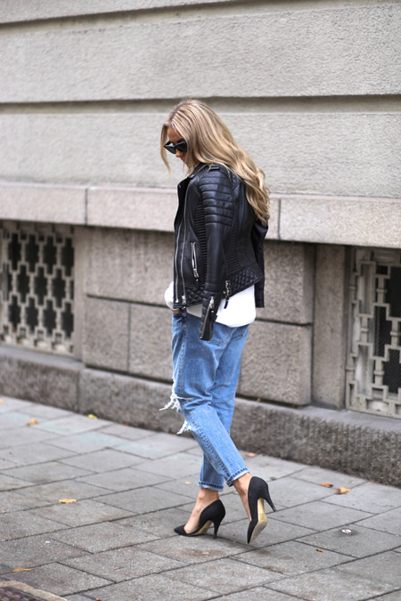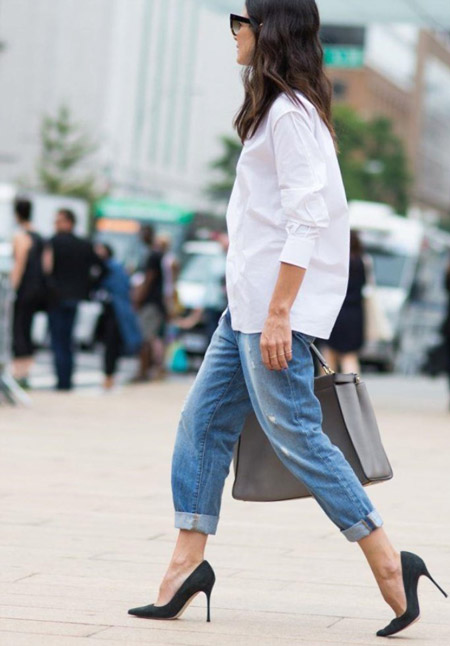 In the new season, black pumps-shoes are advised by stylists to wear with boyfriends, skinny, with high-waisted jeans, mom jeans and with newly popular flared models. The top can be any, as long as it fits into the outfit.