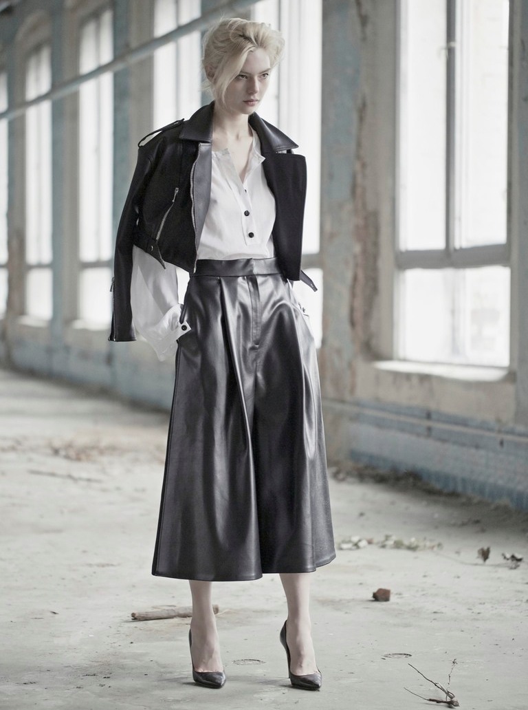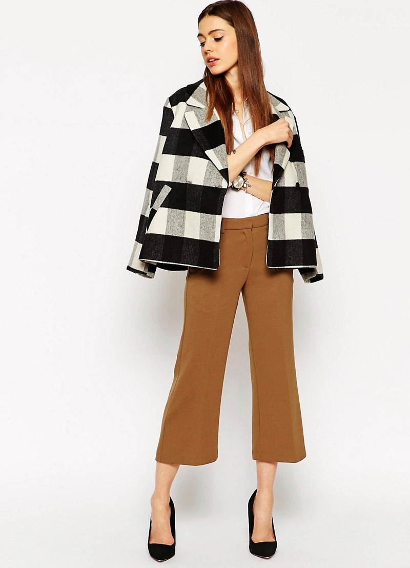 The actual colors of the culottes with black boats will be white, burgundy, navy, and beige. Pick up a jacket and a solid top to match them, perhaps even a shortened one.