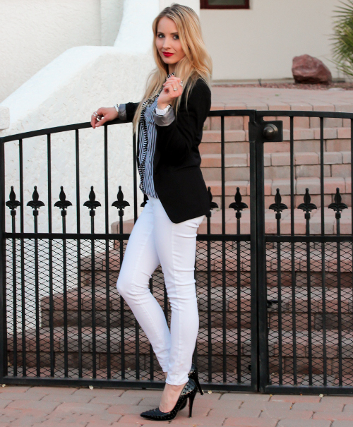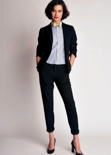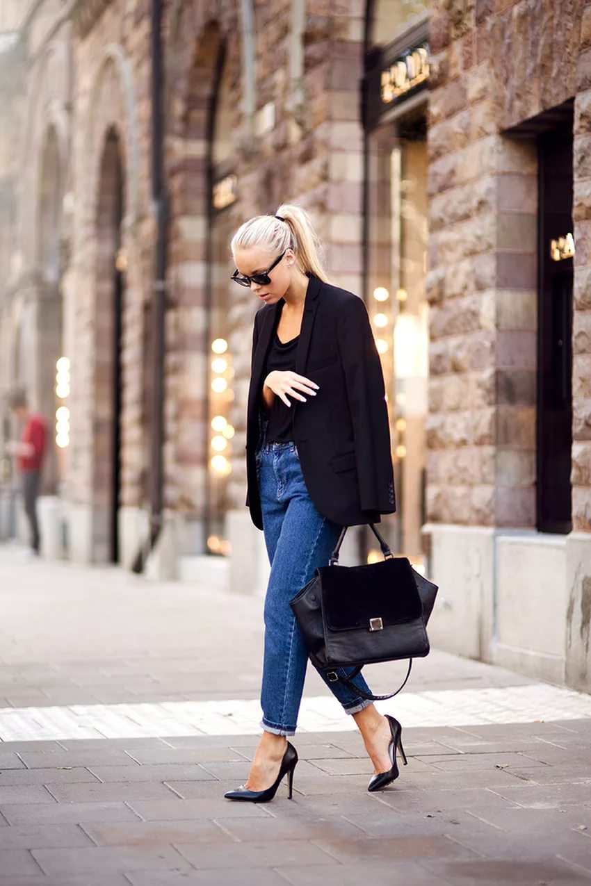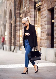 Blue jeans - boyfriends in the men's style, in an unusual stylistic union with a light top and a large white jacket, very harmoniously combined with leather classic boats on a high stiletto. A big black bag will be the best complement to the outfit.