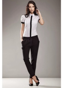 A chic outfit, suitable even for an evening out, is made up of a classic combination of things: skirts - a pencil made of exquisite snow-white lace and a black fitted jacket. Open toe shoes perfectly complement the outfit.