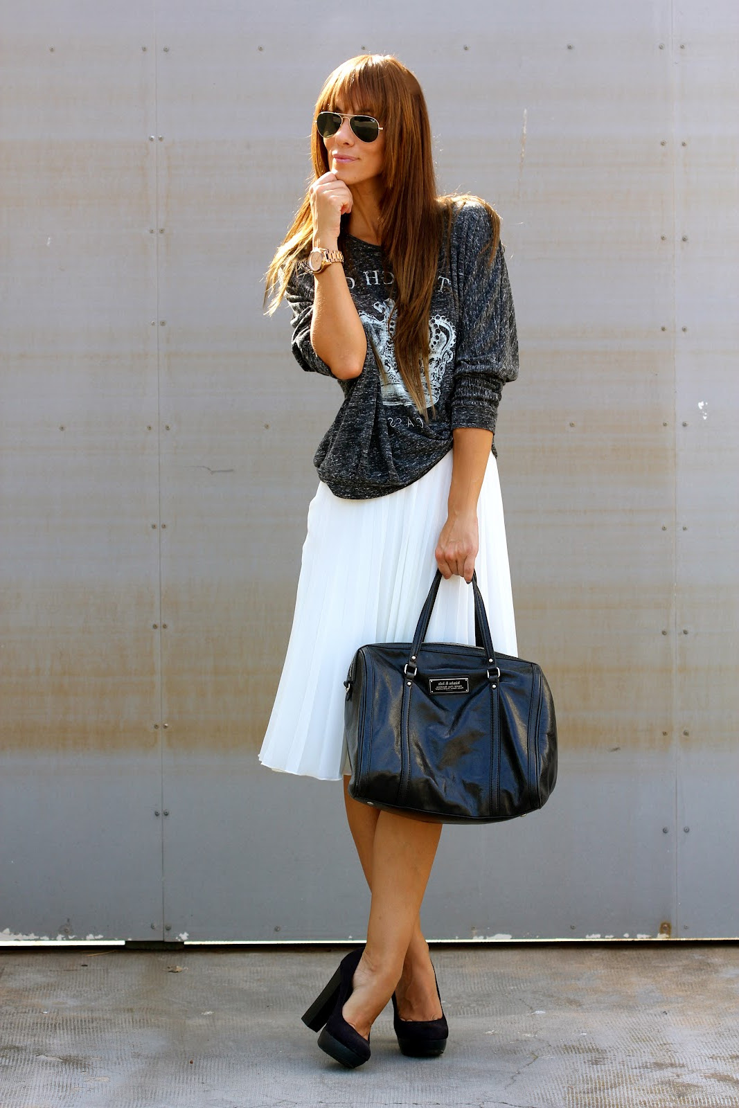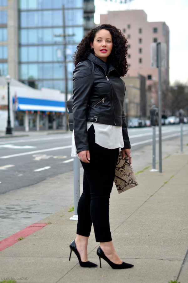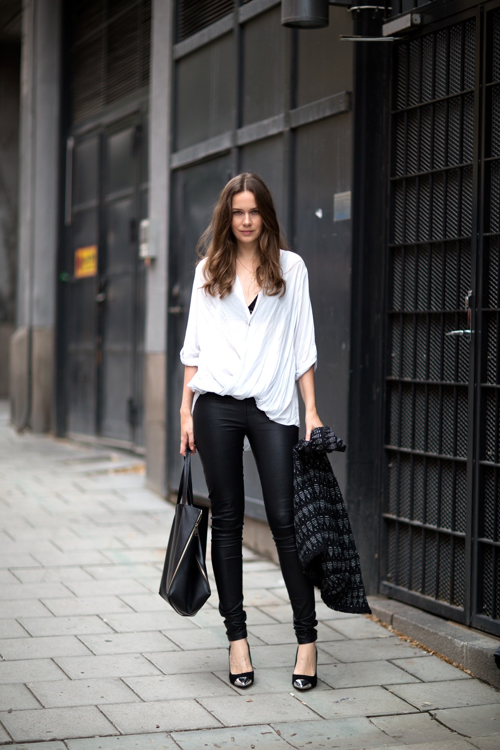 An outfit that combines a touch of elegance and sexuality, consists of leather black leggings, a white loose-fitting shirt, worn over a black tank top. A large rectangular bag and black velvet shoes with a silver metallic toe fit perfectly into this image.