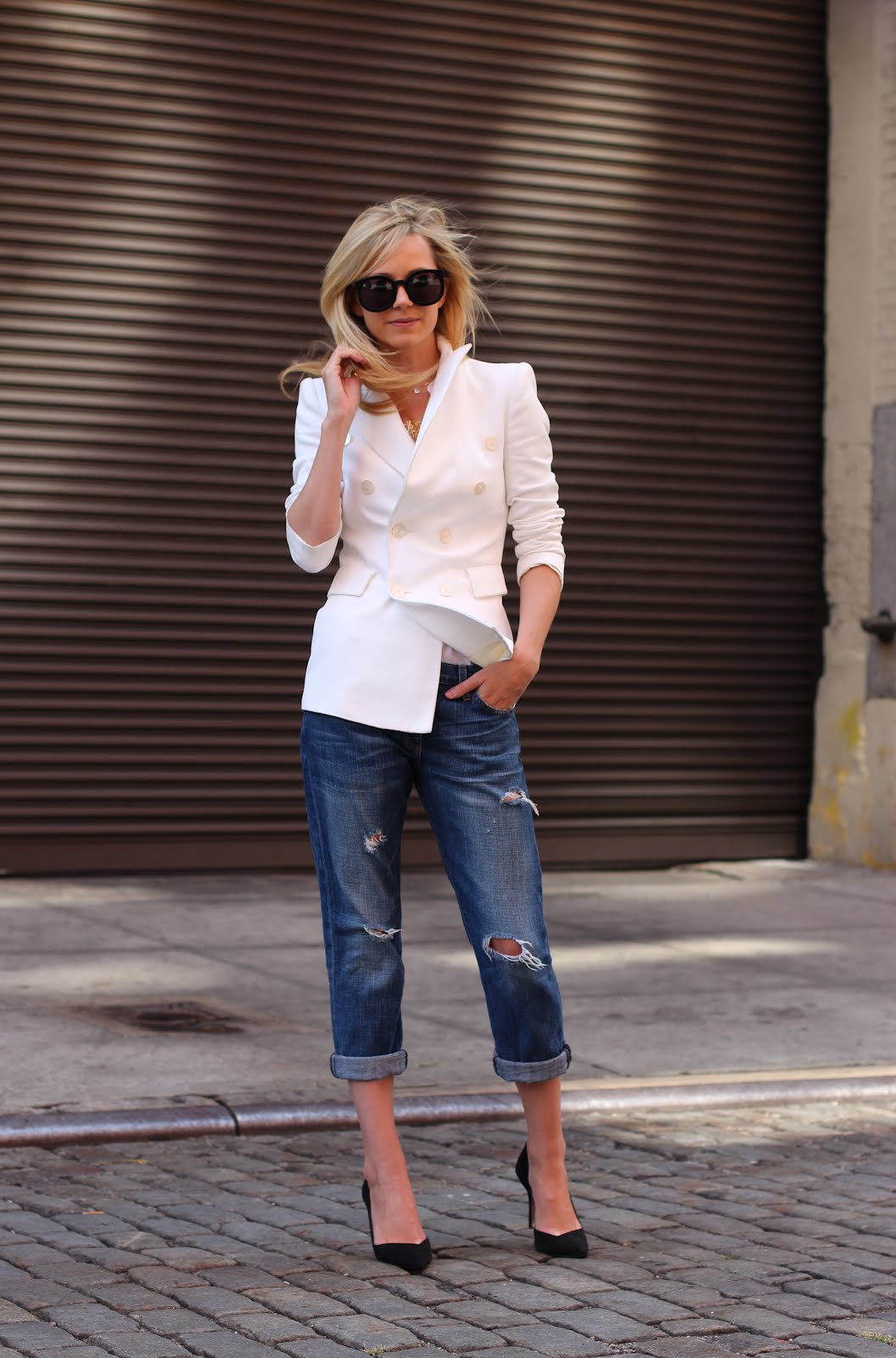 A stylish urban look that combines a white oversized cotton shirt and light-colored jeans — boyfriends with scuffs — is beautifully complemented by elegant black suede pumps.