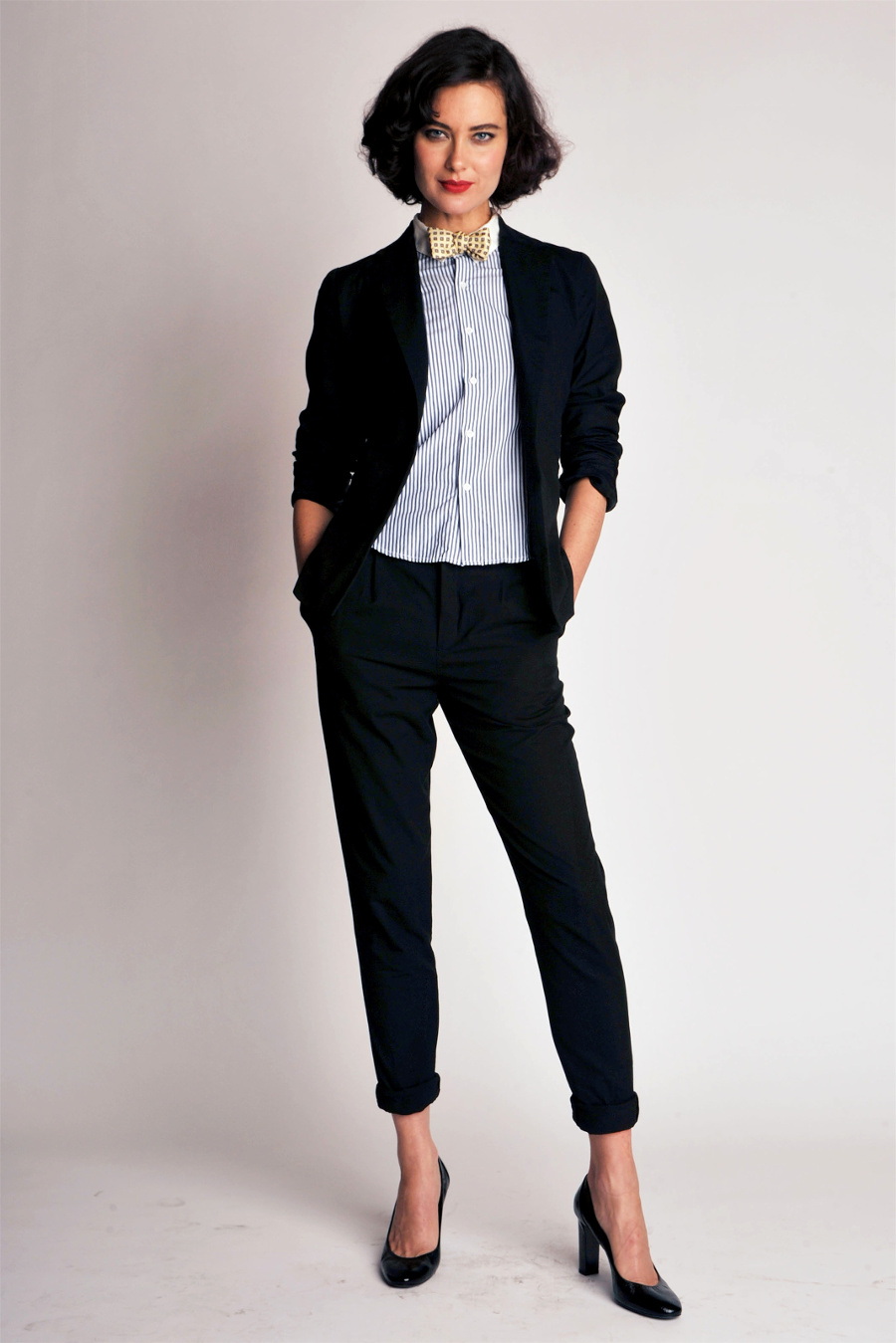 Awesome business look with a touch of chic and luxury! A business three piece suit, consisting of skinny trousers, a jacket and waistcoat, is harmoniously complemented by a blouse with small ruffles at the collar. Leather black shoes with thin high heels, with a hidden platform perfectly completes the outfit.