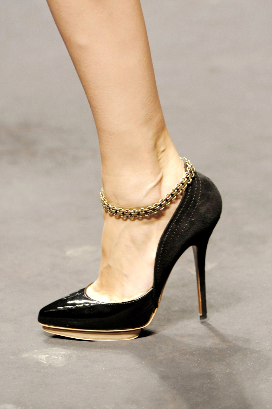 Among the popular decorative elements on the shoes, it is impossible not to mention the metal chains that adorn the edges of the product. But when choosing such a model, it is necessary to pay attention to the fastening of this chain: it’s best to have it sewn, since the glue can dry out pretty quickly and the decor will just disappear.