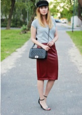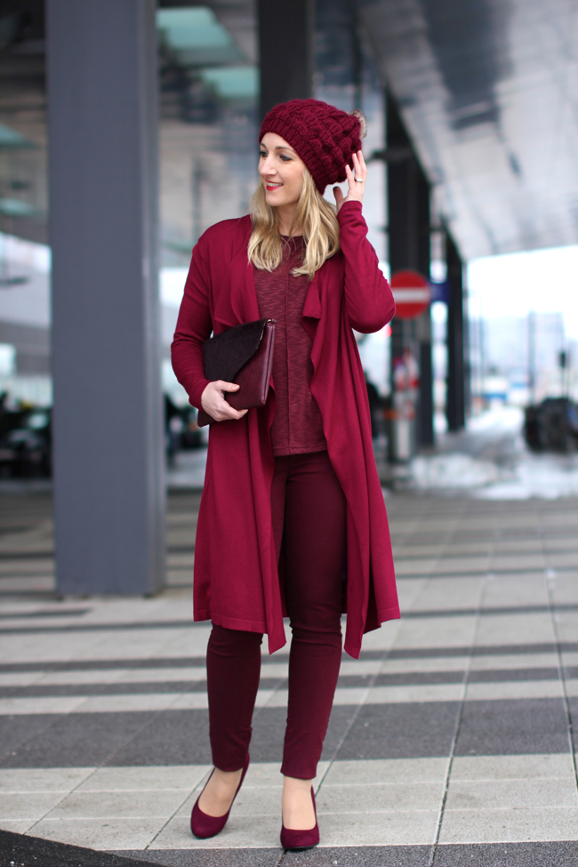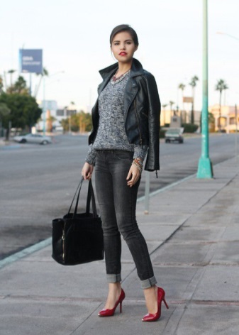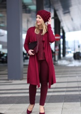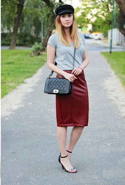 The gray color itself is rather laconic and modest. The outfit of such a boring shade, diluted with charming shoes of Marsala color, is visually enlivened and becomes more saturated.
