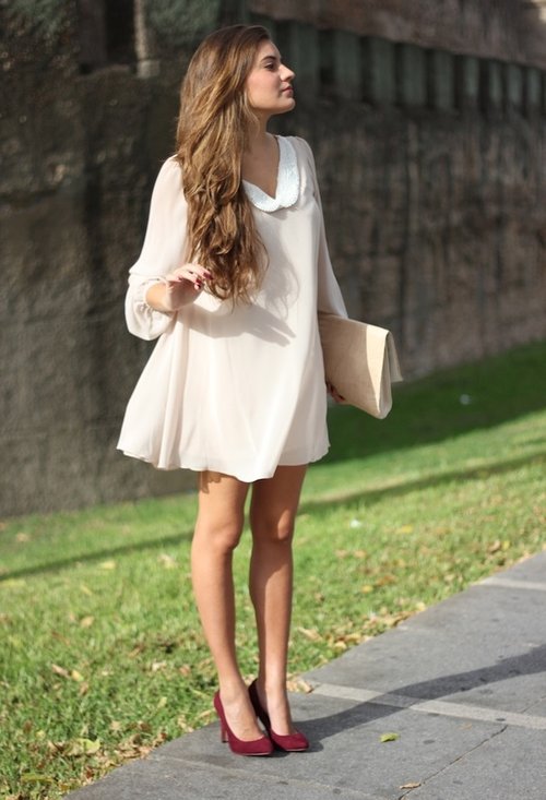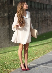 Shoes of a beautiful wine color create a magical and romantic image in combination with pink, lilac, light violet and peach clothes. The combination of a short pink dress made of flowing light fabric and pointed-toe marsala-colored shoes looks very fresh and youthful.