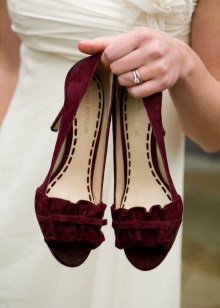 Marsala shoes look very sophisticated and noble. In this color can be performed classic boat, models with heels or square heels. A toe in shoes of such a beautiful color can be either open or closed and have a rounded or pointed shape.