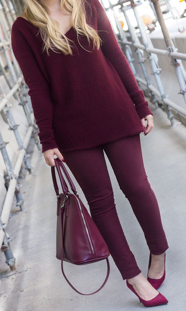Wear a gray, black or cream trouser suit with Marsala footwear for a stylish and elegant look.