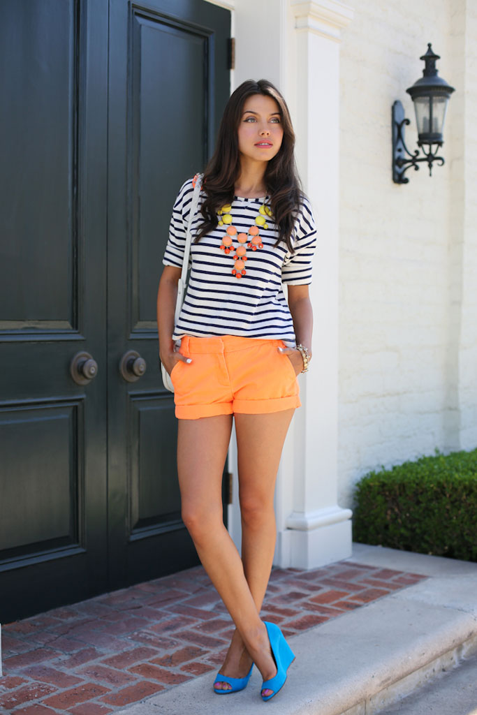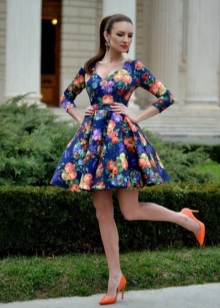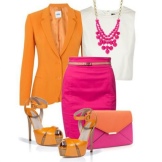 Juicy orange is in harmony with caramel, white, green, blue and cream. A bright and attractive look is easy to create using classic summer dresses or blouses with different skirts, complemented by colored shoes. Poisonous fuchsia diluted with a playful orange color in a dress will highlight the bright personality of a stylish fashionista.