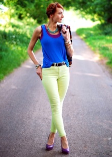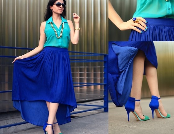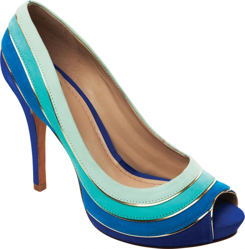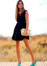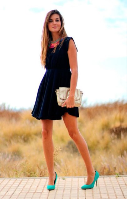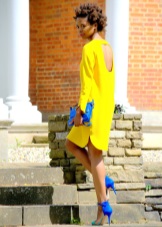 A bright and juicy image can be made up of blue shoes and clothes of green, yellow, pink or white color. Beautiful models of the heavenly colors perfectly complement the light turquoise, lilac and blue dresses, decorated with thin straps at the waist.